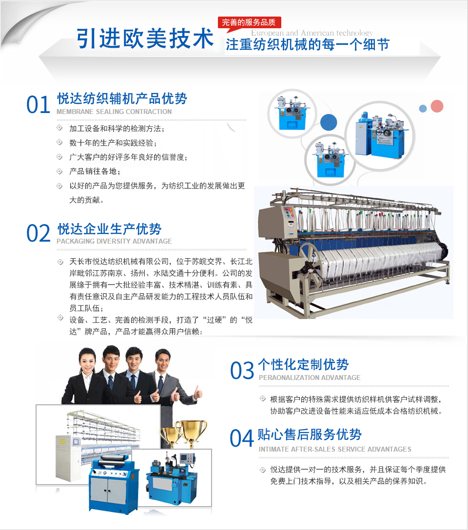 天長市悅達紡織機械有限公司座落在皖東天長市仁和集鎮人民西路88號,公司位于蘇皖交界、長江北岸毗鄰江蘇南京、揚州、水陸交通十分便利。 公司是主要生產紡織平車安裝工具、紡部輔件及配件綜合性企業(yè)。已有二十多年的生產歷史,在激烈的市場競爭中始終保持優(yōu)良的質量、優(yōu)化的價格、齊全的品種優(yōu)勢。產品暢銷全國各地,深受新老客戶的好評。 公司以服務客戶滿足用戶為己任,不斷提高產品加工精度,拓展系列品種,以高標準、高起點滿足客戶需求。公司精神:創(chuàng)新、開拓、務實。公司宗旨:追求誠信、追求質量、追求服務、為用戶著想。